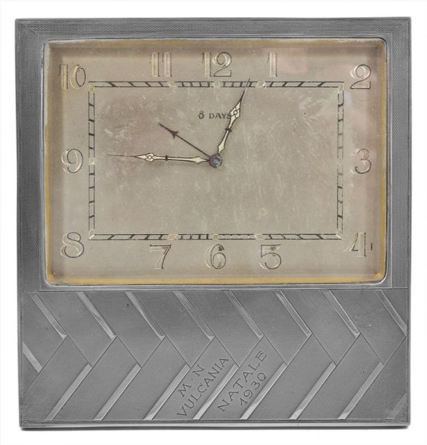 An Art Deco 8-day white metal bedside clock, of square form, with engine turned frame, Arabic numerals, engraved M.N.Vulcania Natale 1930, and easel back, width 16cm . The movement appears to work, but requires a clean and overall