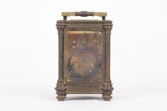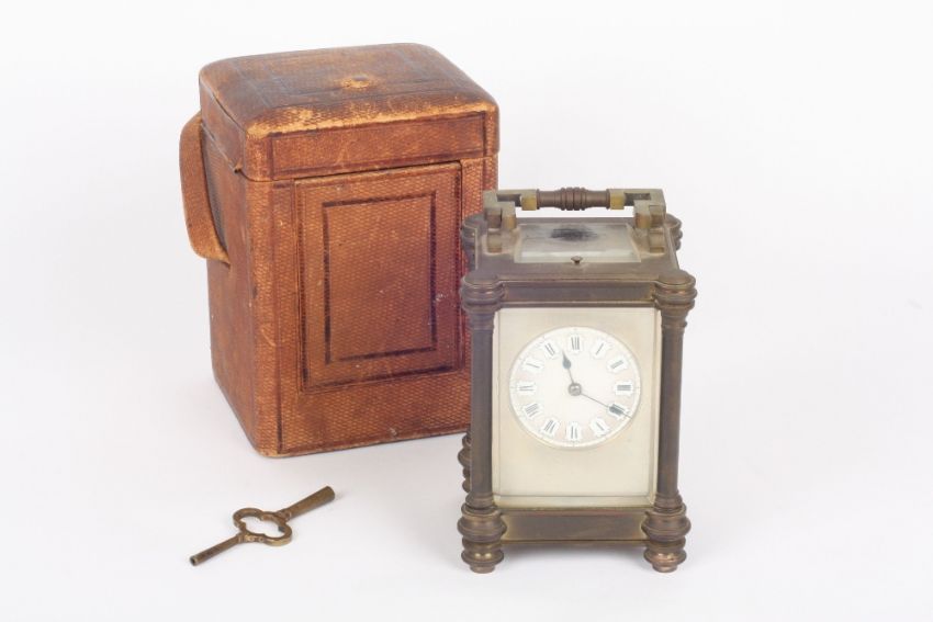 A Victorian brass repeater carriage clock, the circular enamel dial with Roman numerals, in a plain case with carrying handle, striking on a single gong, contained within a later leather carrying case. 19cm high including handle . Appears to be in working order, the case is quite heavily tarnished. With original escapement.