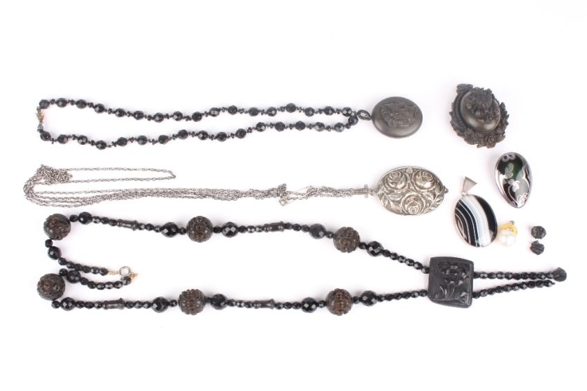 A collection of assorted jewellery, including two jet bead pendant necklaces, a white metal pendant locket, a banded agate pendant, a green and white metal pendant and an earring . One stone broken from one necklace, otherwise reasonably good condition.