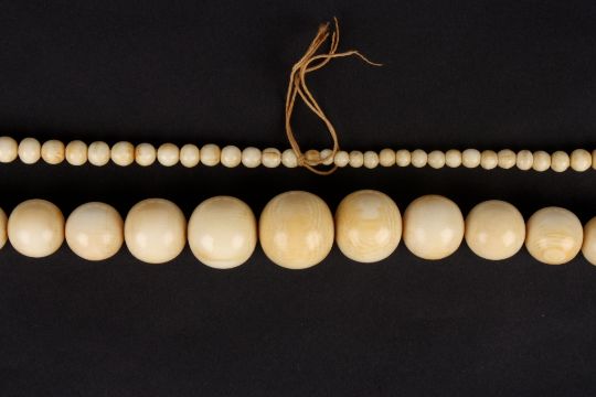 An early 20th century graduated ivory bead necklace, circa 1920, together with a banded stiff ivory slave bangle (2). Largest bead 20mm. Bangle 6.75 internal diameter. Purchased by the vendors father in Africa in the 1920s . Good condition.