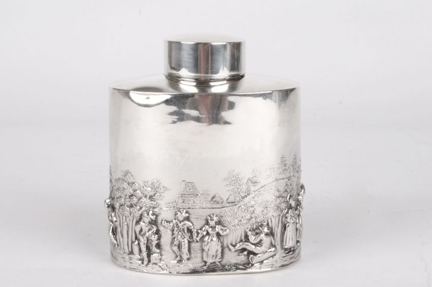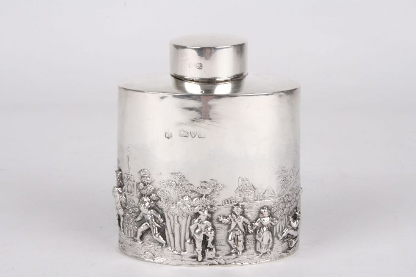 A silver tea caddy, hallmarked Chester, 1901, with makers initials for George Nathan Ridley Hayes, with embossed figures in a landscape, 2.8ozt, height 9cm . with slight dent to the rim at the top and the bottom