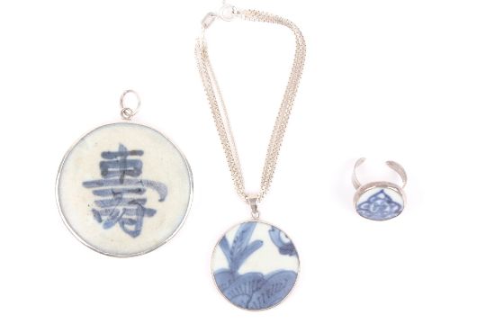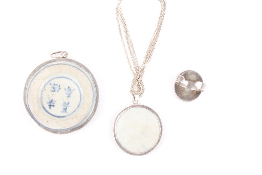 Three Chinese blue and white pottery fragments mounted as jewellery, two mounted in silver coloured metal as pendants, and one as a ring, diameter of the larger pendant 5.2cm .