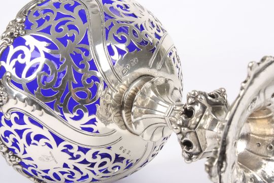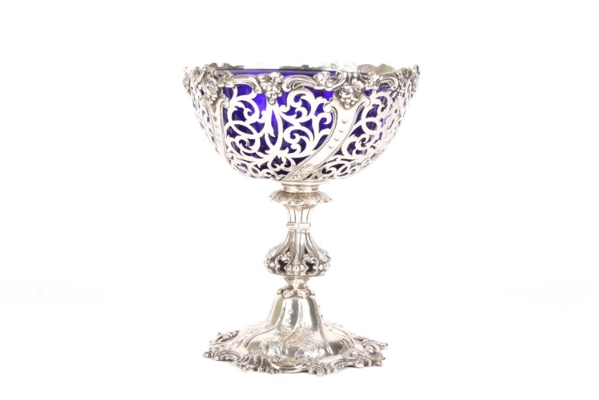 A Victorian pierced silver bon-bon dish with blue glass liner, hallmarked London 1865, the rim moulded with grapes and vine leaves, pierced scrolled body and supported on hexagonal stem to a foliate engraved scrolled base. With engraved hand crest. 13.7 ozt. 18cm high . Good condition, possibly an associated liner.