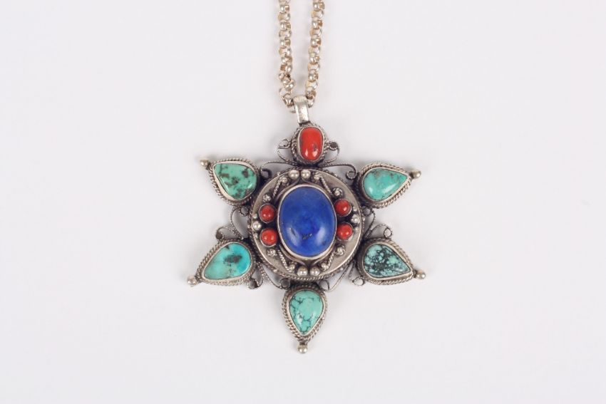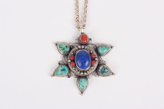 A star shaped coral, turquoise, lapiz lazuli and white metal pendant the outer section of the pendant inset with tear drop shaped turquoise, with lapiz to the centre flanked by beads of coral, and a single coral stone to the suspension ring, stamped on the reverse, with later chain, diameter 7.5cm . The turquoise stones in good condition. Coral and lapiz with a few surface chips . Overall in good condition.