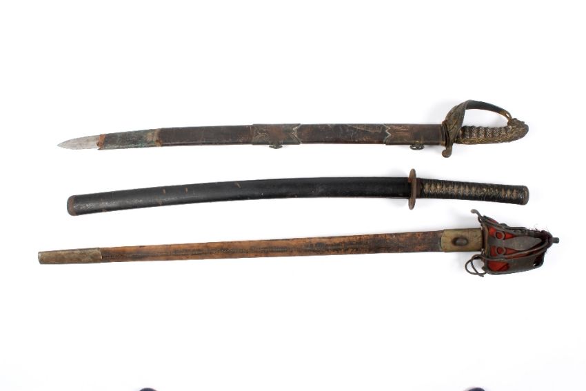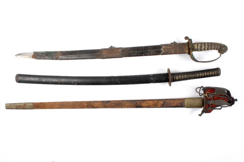 Three 19th century swords, comprising: a Victorian naval sword with gilded lion hilt and shagreen handle in a leather scabbard; a Japanese Katana with black lacquer scabbard; and a Continental sword with basket hand guard and leather scabbard -3 . All in very poor condition.