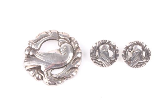 A Georg Jensen Sterling silver suite, comprising circular brooch and matching earrings decorated with birds, marked with makers name and marked sterling silver, diameter of brooch 5cm . In good overall condition