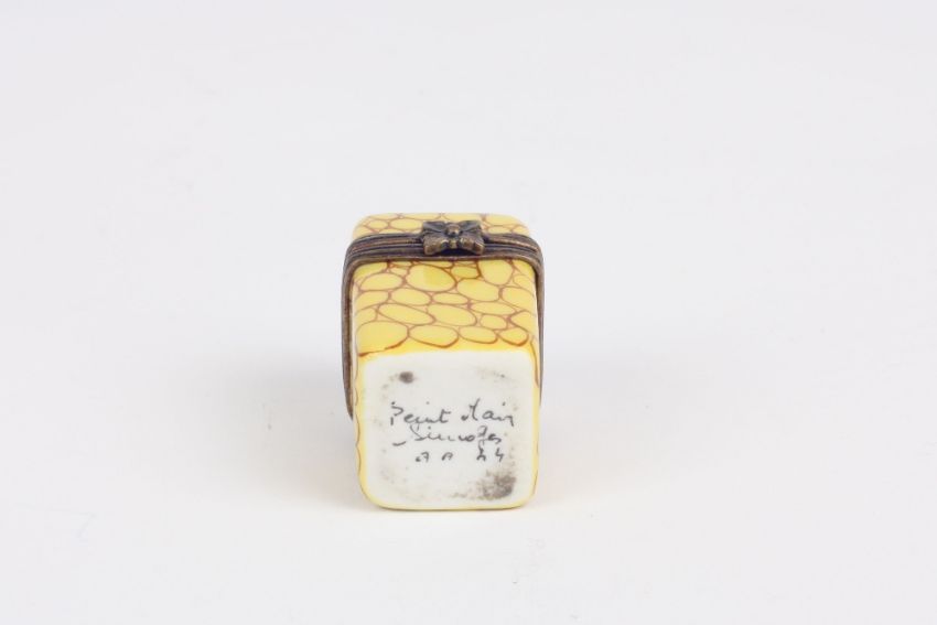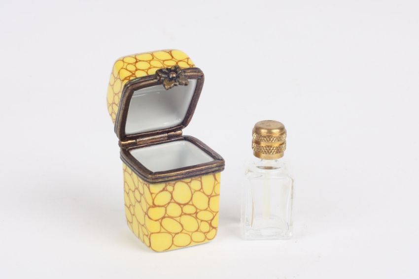 A small Limoges style painted porcelain scent bottle box, late 20th century, painted with flowers, the lid opening to reveal a small glass scent bottle. 4.25cm high . Good condition, no damage.