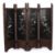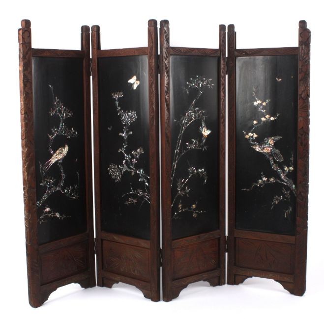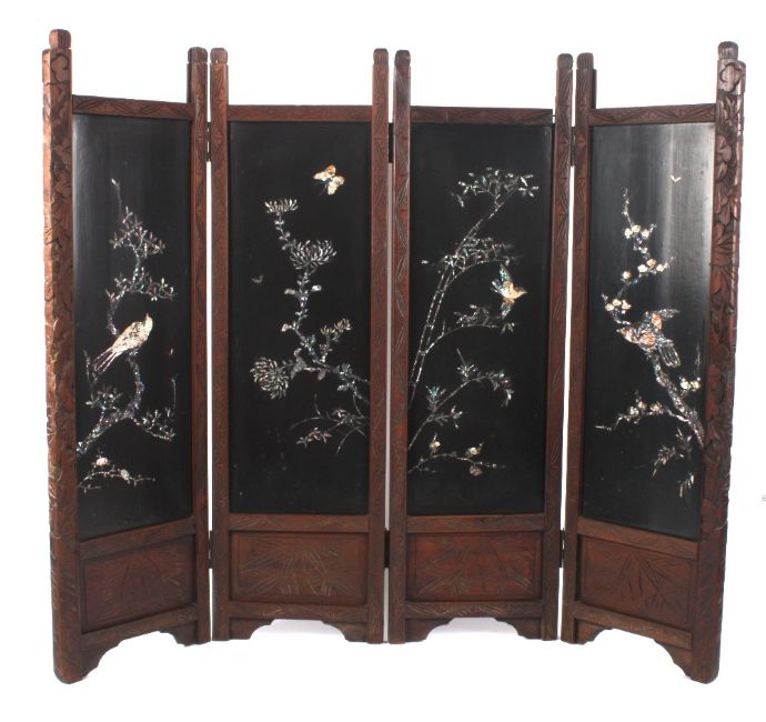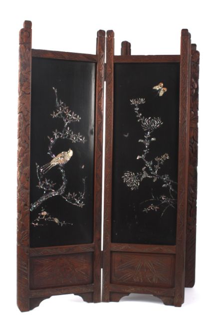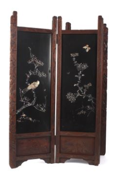 A small early 20th century Japanese Shibyama four fold table screen, each panel inlaid with birds and flowers in abalone shell and mother of pearl on a black lacquer ground, with a carved hardwood frame. 109cm wide, 89cm high . Generally good condition, missing fretwork sections to the top of each panel.