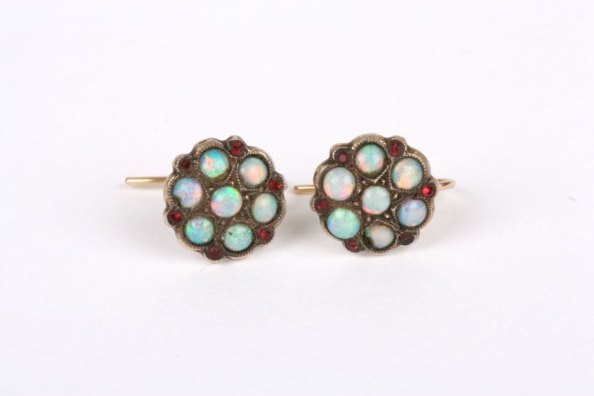 A pair of early 20th century opal and ruby earrings, set in unmarked yellow metal, probably gold . No major damage, few small chips to opals.