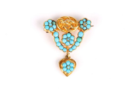 A turquoise and yellow metal brooch, formed a central knot surrounded by turquoise roundels, with pendant below, metal unmarked, probably gold. 5.2 grams . Good condition.