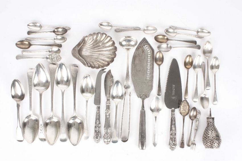 A collection of assorted silverware, including flatware, fish servers, silver scallop shell scent bottle, spoons etc. Weighable silver 29 ozt . Generally good condition.