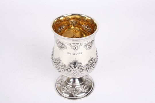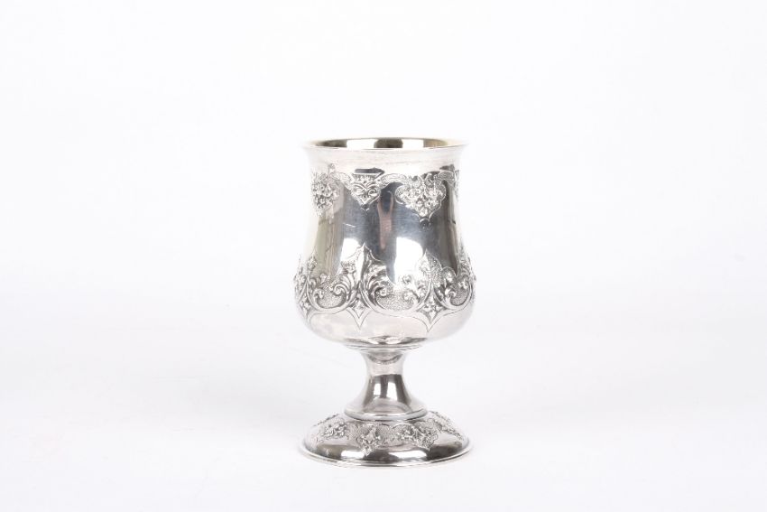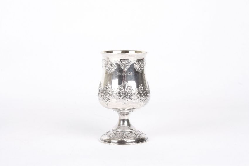 A Victorian silver-gilt goblet, hallmarked London 1854, with initials for Robert Henell, with repoussé decoration of feathers and scrolls, 4.8 ozt, height 12.5cm . In good overall condition