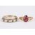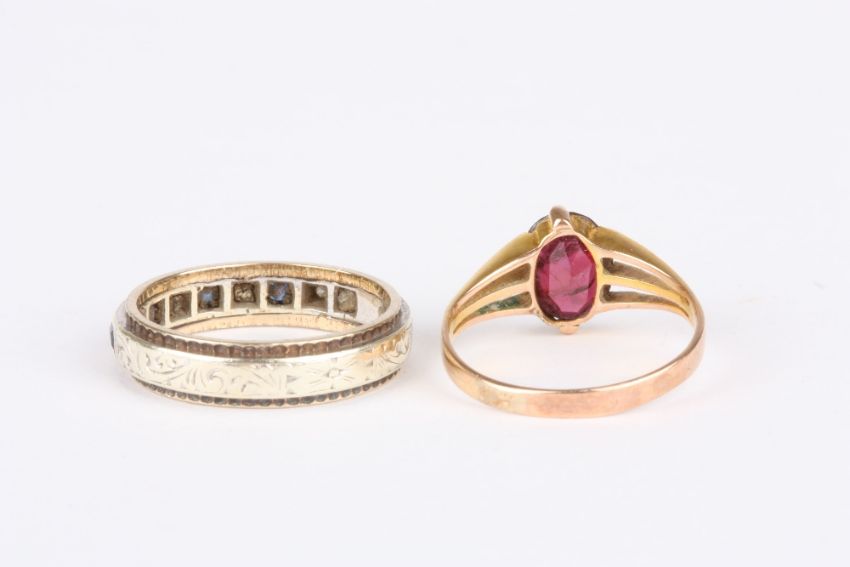 A 9ct gold ring set with garnet coloured stone, together with a 9ct gold, diamond and sapphire eternity ring (2). Combined weight 4.4 grams. Single stone size: I ½. Eternity ring size: K . Single stone fractured inside.