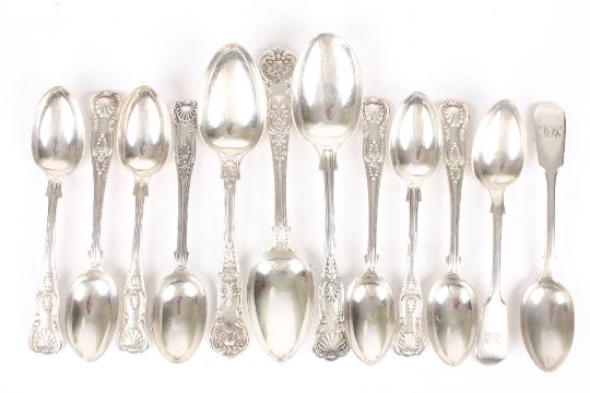A collection of twelve Victorian and later assorted spoons, including teaspoons and dessert spoons, queens pattern and fiddle pattern. 15.2 ozt . Generally good condition, some wear in places.