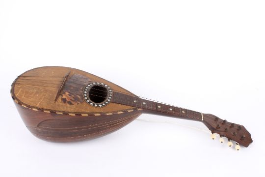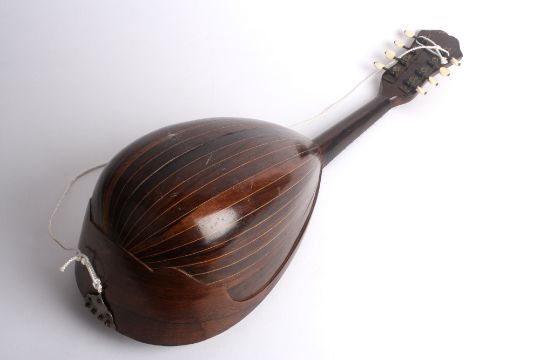 A late 19th century Italian Neapolitan Ferrari Mandolin, with segmented back, and barber pole stringing, the finger board with mother of pearl inlay, bone tuning pegs and tortoiseshell finger board. With internal paper label. 60cm long . Loose segment to the back, some veneer chips to the head stock, missing one fret, scratches to the top.