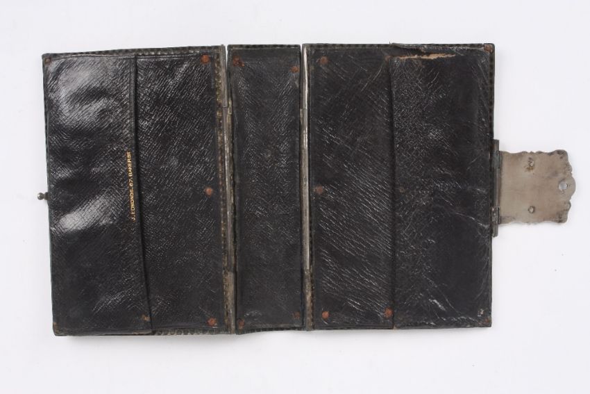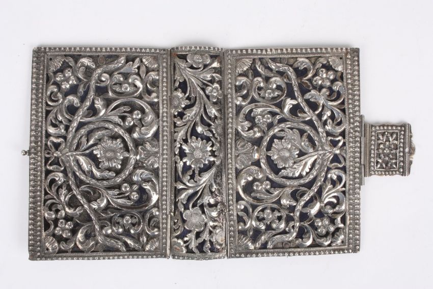 A miniature Common Prayer book contained within a fitted silver case, the pierced silver case decorated with foliage in the form of miniature bag hallmarked London 1893, with makers initials S.M. & Co for Sampson Mordan & Co, together with a silver coloured metal and leather prayer book cover marked inside for J.Edmonds, the former width 5.5cm . Good clear hallmark, case and book in good overall condition.