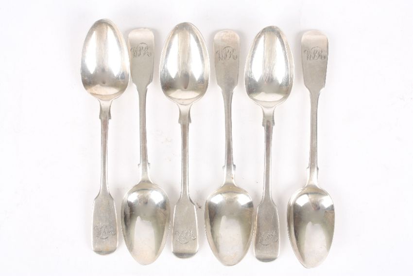 A set of six Victorian silver fiddle pattern teaspoons, hallmarked London 1853, with engraved initials. Makers mark: Charles Boyton II. 3.8 ozt . Generally good condition, some wear.