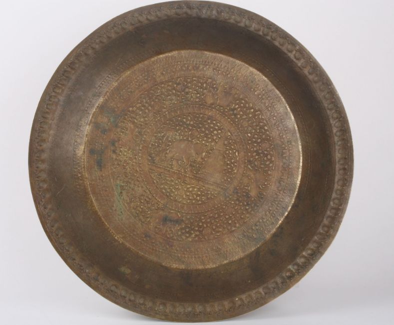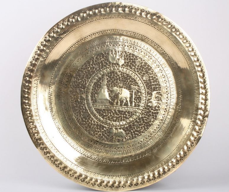 An early 20th century Indian large brass tray, decorated with a central roundel of an elephant surrounded by four smaller elephants, all on a ground of ornate scrolling flowers with acanthus decorated borders, 40.5cm diameter . Good condition, slightly bent.