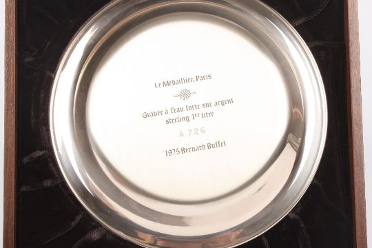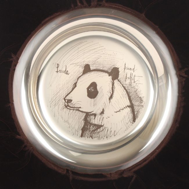 A 1974 Bernard Buffet silver plate decorated with a Panda, marked .925, in a fitted box with original paperwork. 6 ozt. 20cm diameter . Good condition.
