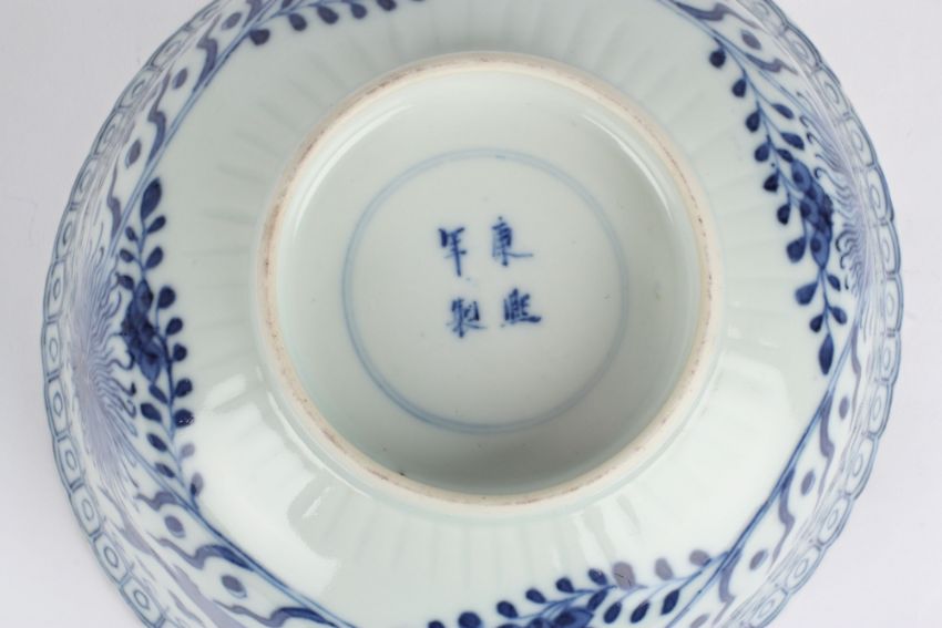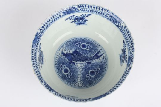 A late 19th century Chinese hand painted bowl, decorated in blue depicting sea urchins and fish to the sides and interior, with four character mark to the base, and scalloped rim, diameter 17.5cm . With a few nibbles to the rim and a two minor chips the largest measuring approximately 5mm in width