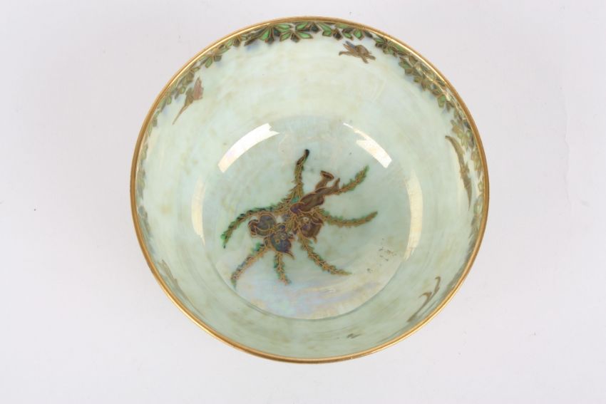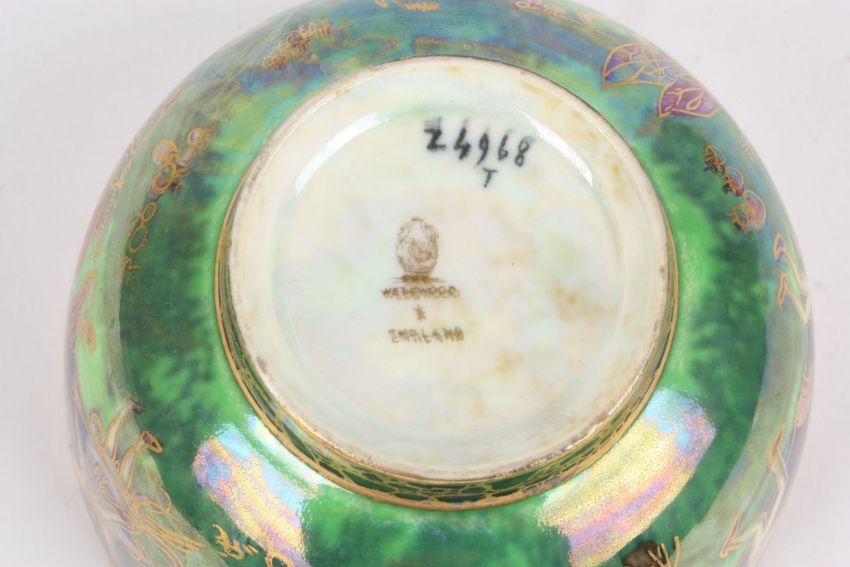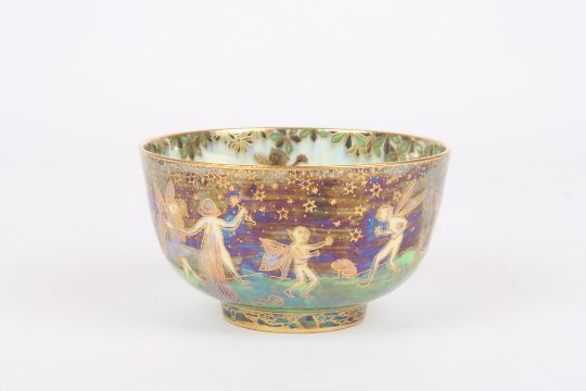 A Wedgwood Fairyland lustre bowl by Daisy Makeig Jones, circa 1920, pattern number Z4968, the body decorated with fairies and woodland creatures against a starry night sky. Printed and gilt stamped mark to base, 10cm diameter . Appears to be in good condition and rings well with no visible signs of restoration or damage.