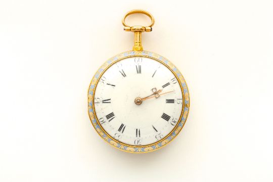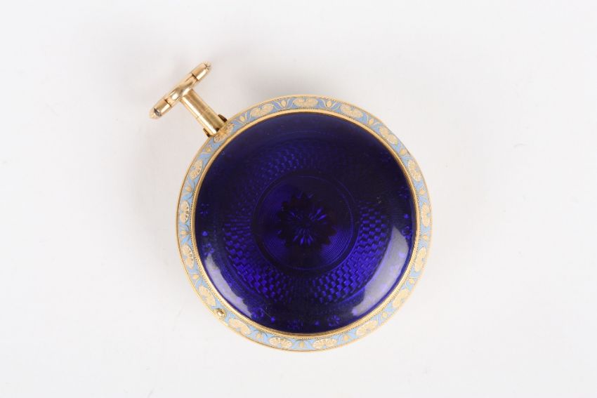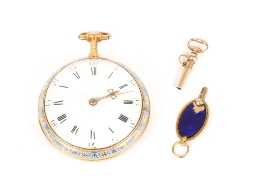 An 18K gold Vulliamy of London open face enamel pocket watch, the white enamel dial with black roman numerals, the case decorated with a pale blue enamel rim with kidney shaped scrolling design, the reverse decorated in blue guilloche enamel. The four pillar fusee movement signed Vulliamy London, with pierced grilled and removable cover. The inside of the case with passant hallmark and heart shaped makers mark with initials ‘SG’. Together with enamel winding key. Case 48mm diameter . Hairline crack to dial, movement appears to be overwound. Light scratching to the enamel back. Enamel chips to the key. Movement needs a clean