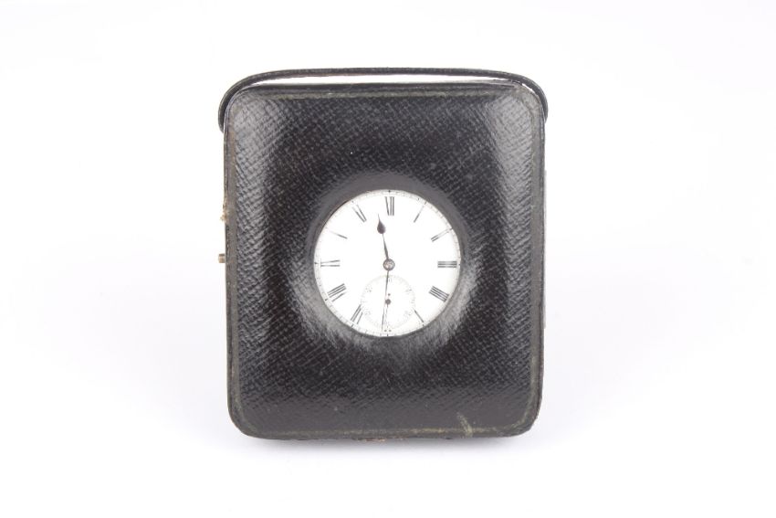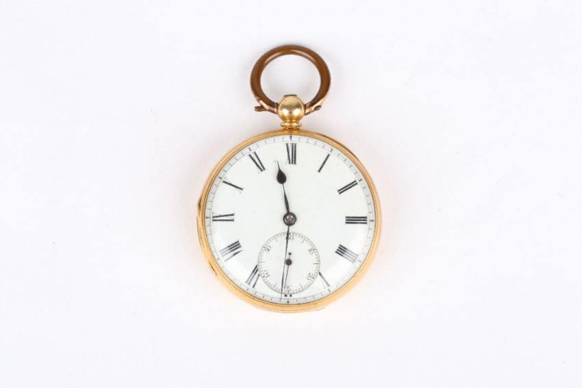 A Victorian 18ct gold open face pocket watch, hallmarked London 1864, by Ollivant Botsford, with white enamel dial and black Roman numerals. The movement signed Ollivant Botsford Exchange, Manchester, No. 21076 With plated suspension loop. In a leather travelling easel case. Dial 3.8cm diameter. Total weight 79.8 grams . Engine turning worn away, winds and appears to be in working condition, ticks ok, but not tested.