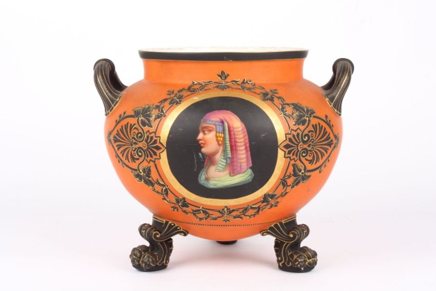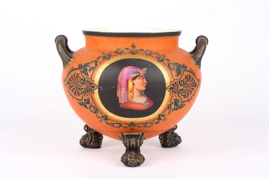 A Victorian jardiniere, of rounded form predominantly coloured orange with hand painted details of flowers and tendrils framing roundels on either side depicting Egyptian ladies, with carrying handles to the sides, raised on four scroll feet, unmarked, height 25cm . A few scratches to the hand painted ecoration particularly the black but no chips, cracks or damage to the jardiniere.