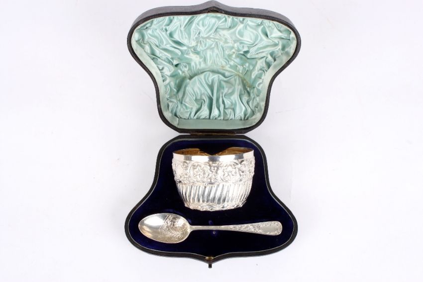 A Victorian christening set, the silver gilt bowl hallmarked London 1895, with repousse of scrolls and flower decoration, contained within a fitted case with an associated spoon, weight of bowl 2.95ozt . Later spoon, hallmark on bowl is rubbed