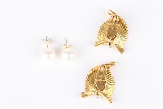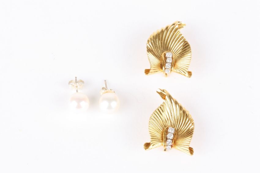 A pair of 18ct gold and diamond leaf shaped earrings, each set with a graduated row of diamonds, stamped 18k, together with a pair of Tiffany & Co. pearl and silver earrings. Leaf earrings 14.3 grams . Good condition.