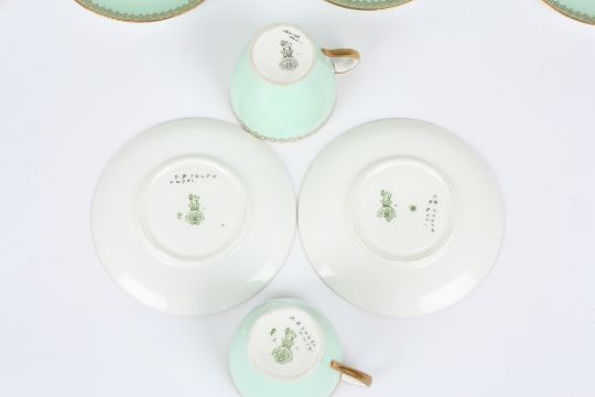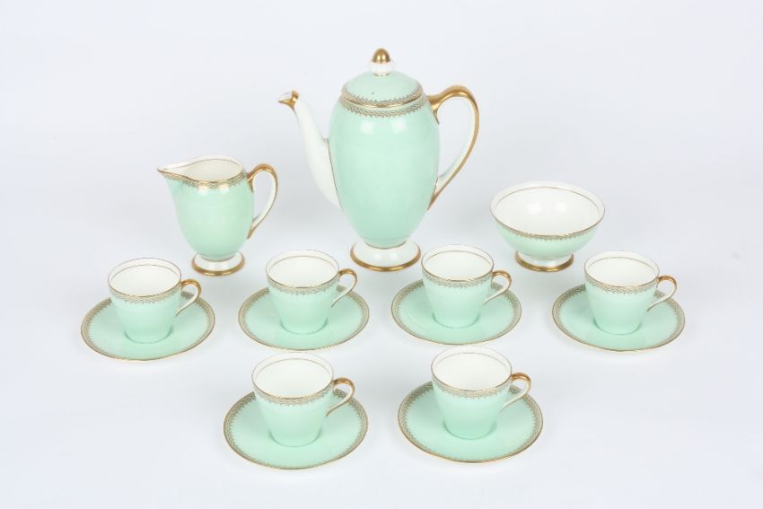 A Royal Doulton porcelain coffee service, Decorated in sage green with gilt highlights, comprising a coffee pot, milk jug, sugar bowl, six cups and saucers. Mark in green to base and number BB3445, HH361 . Generally good condition, some crazing to the teapot and others in places, no obvious damage.