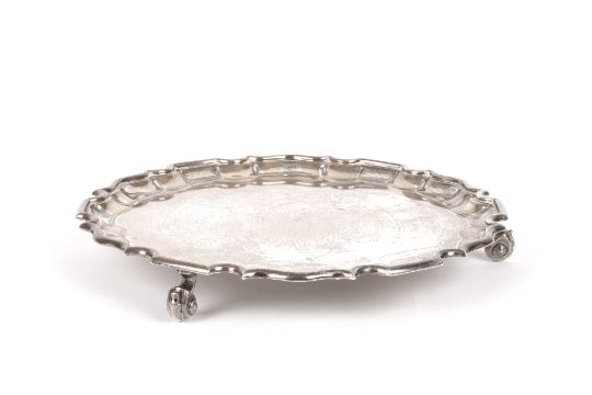 A silver salver, hallmarked Sheffield, 1926 with initials for T. Bradbury & Sons, with pie crust edge raised on three scroll feet, diameter 26cm, weight 20ozt . In good coverall condition