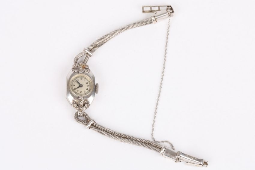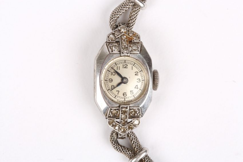 A ladies Art Deco platinum and diamond cocktail watch, with silvered dial, set within a platinum case with diamond shoulders, set on a 9ct gold strap. Weight without movement 10.1 grams . Good condition, appears to be working but not tested.