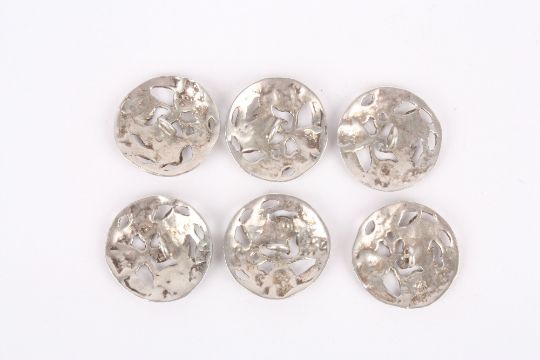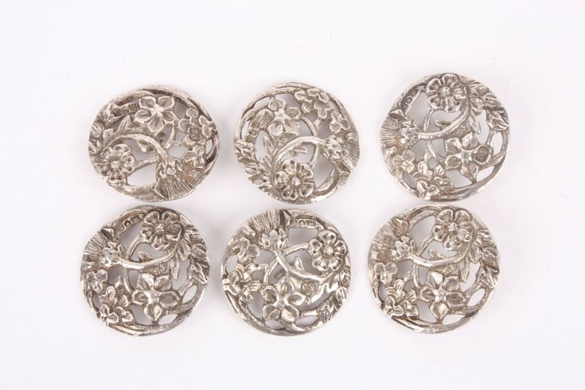 A set of six Edwardian silver buttons decorated with the four flowers of the United Kingdom, hallmarked London 1903, with makers initials SJ probably for Samuel Jacob, of circular form pierced and engraved with rose, thistle, daffodil and shamrock, 0.82ozt, diameter 2.5cm . Good clear hallmarks in good condition