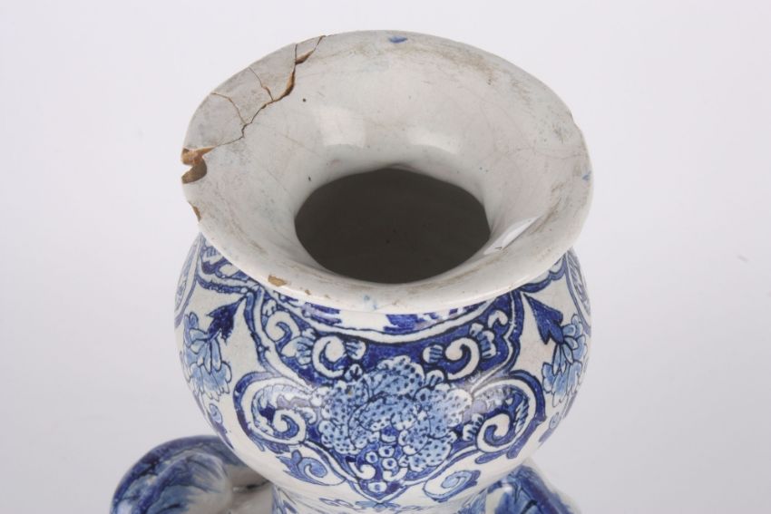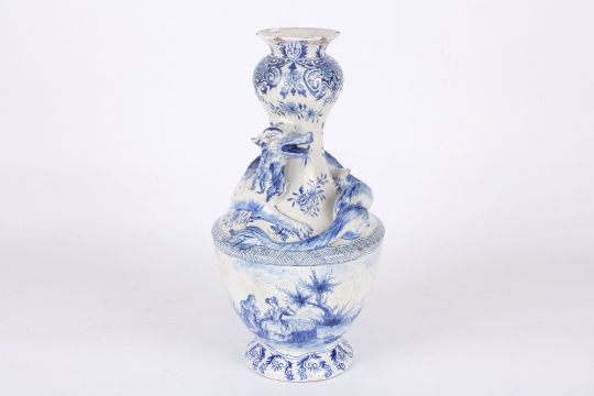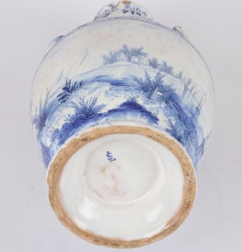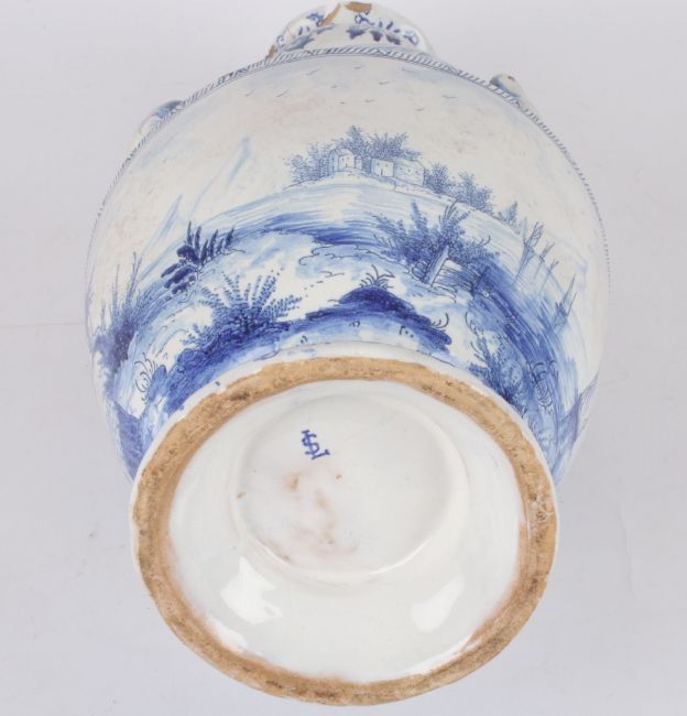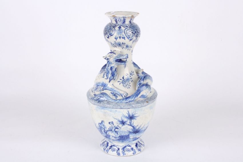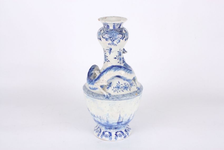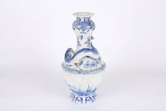 A 19th century Dutch tinglaze blue and white dragon vase, the body painted with a scene of a young couple in a landscape surrounded by boats, the body surmounted and surrounded by a dragon. With SL monogram to the base. 37cm high . Repaired chip to the rim, some glaze chips.