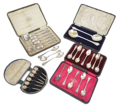 A collection of assorted silver flatware, comprising: a pair of cased serving spoons Birmingham 1909; a set of 11 Continental white metal teaspoons stamped .800; a set of 12 Continental white metal teaspoons stamped 0.8 and a cased set of 6 demitasse coffee spoons Sheffield 1928 19.7 ozt . Cases mis-matched, some wear and tarnish.