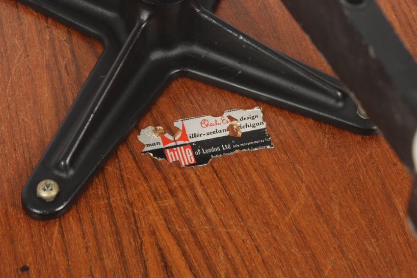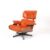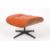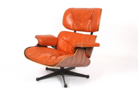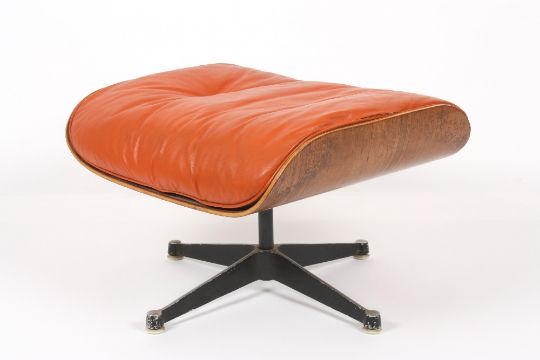 A Charles and Ray Eames rosewood and orange leather lounge chair and ottoman, models 670 and 671 1960s the chair with paper label remnants, height 82cm. The chair was originally exclusively produced by Herman Miller, although for a short period in the 1960s the chair was licensed by Hille of which this is an example. . The chair with general wear to the leather particularly in the middle section (lower back rest) where there is some cracking to the leather and around the sides, The leather is a good colour but there is some dirty marks on the arm rests. Two buttons missing on the chair. The ottoman with a split to the leather on one side close to the seem which requires attention. One button missing on the ottoman. However the three buttons are present (but just detached).
