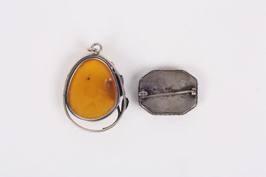 An amber brooch and an amber pendant, the first of octagonal form and mounted in a white metal frame stamped 800, together with an amber pendant mounted in a white metal frame with foliage to the side, the pendant 6cm . The pendant with a small dent to the reverse, the front side in good condition. The brooch with minor surface wear. Both in wearable condition