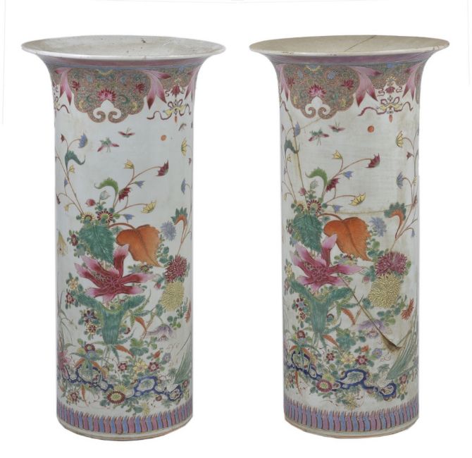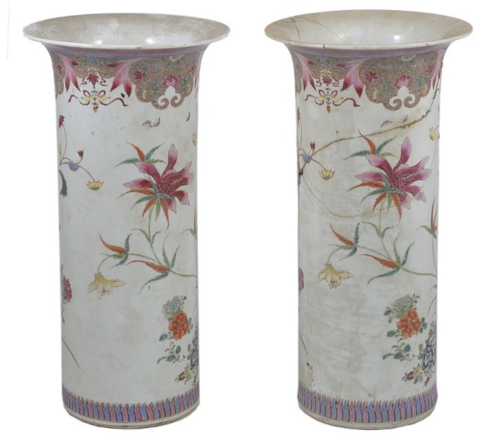 A pair of Chinese 18th century ‘famille-rose’ beaker vases, Yongzheng/Qianlong, each painted in rich enamels with lotus and chrysanthemum issuing from pierced rocks beneath an elaborated foliate and lotus scroll border, 40cm high . One with 4cm haircrack to rim and crack the diameter of the base; the other broken in to numerous pieces and glued together with some losses
