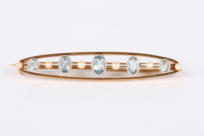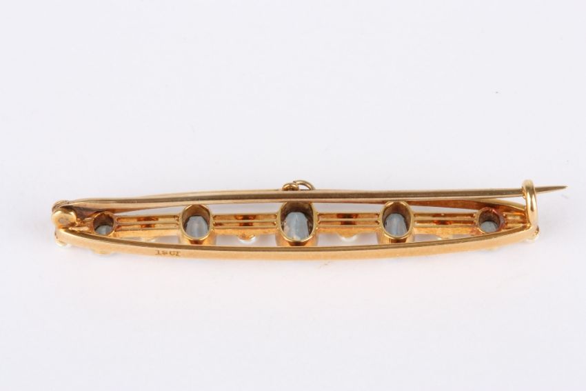 A Victorian 15ct gold, aquamarine and seed pearl bar brooch, set with five graduated oval aquamarines interspersed with seed pearls, the bar stamped 15ct. In a fitted box. 4.9 grams. 5cm long . Good condition.