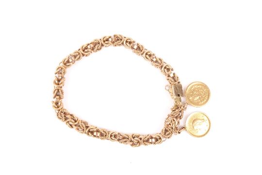 An Eastern gold coloured metal fancy link bracelet, with two small coins attached, unmarked, 35.4g . In good overall condition