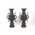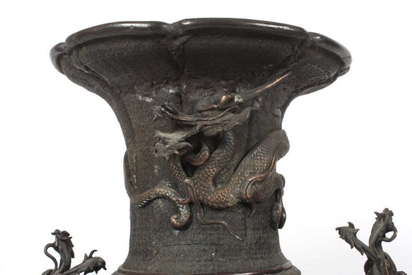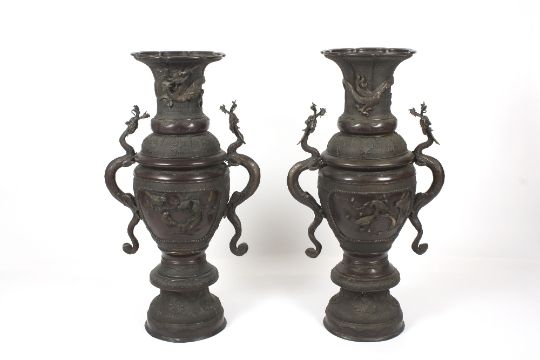 A pair of 20th century floor standing Japanese bronze vases, the urn shaped vases heavily decorated with applied dragons, birds and flowers, height 92cm . With signs of repair around the rim of one of the vases. In fair condition. One base slightly mis-shapen