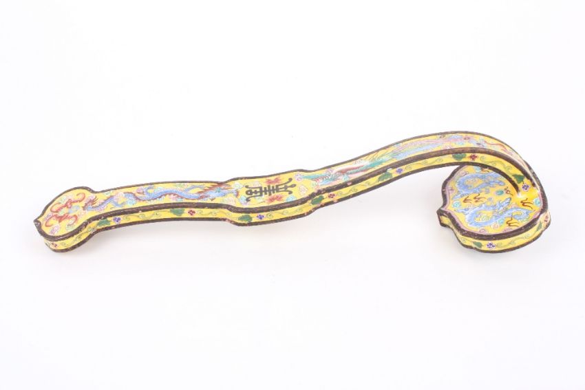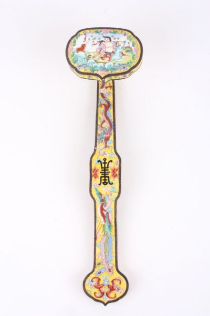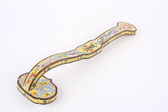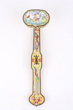 A 20th century Chinese Canton enamel ruyi sceptre, the head painted with a scene of a figure in a landscape with a dog of foe beside him, the shaft decorated with dragons, birds and flowers, the centre of the stem with Chinese character mark. 33.5cm long . Generally good condition, some enamel hairline cracking to the end.