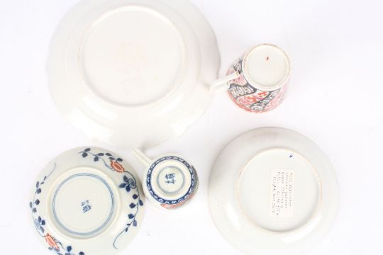 An 18th century Worcester Japan Fan pattern cup and saucer with pseudo Chinese marks, together with a Flight Barr & Barr Worcester Queen Charlotte pattern cup, saucer and plate -5 . Fan pattern saucer with chip to rim, Queen Charlotte trio with minor gilt wear, otherwise good condition.