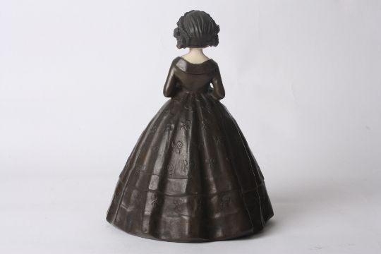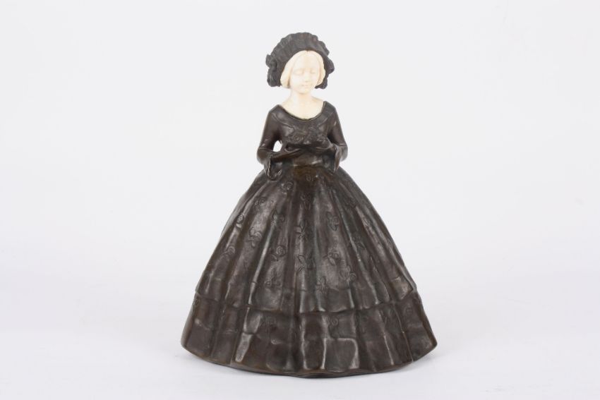 A bronze and ivory model of a young girl with flowers, circa 1900, with well-carved ivory face, wearing a bonnet and holding a posy of flowers, with large flowing crinoline dress, 25cm high . Several cracks to the face, otherwise good condition.