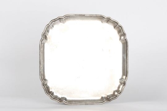 An Edwardian silver salver, hallmarked London 1908, of cushion shape with moulded rolled rim. With engraved inscription ‘From the shadow to the substance, 1912’. Makers mark: Daniel & John Wellby. 15.2 ozt. 23cm wide . Good condition, tarnished