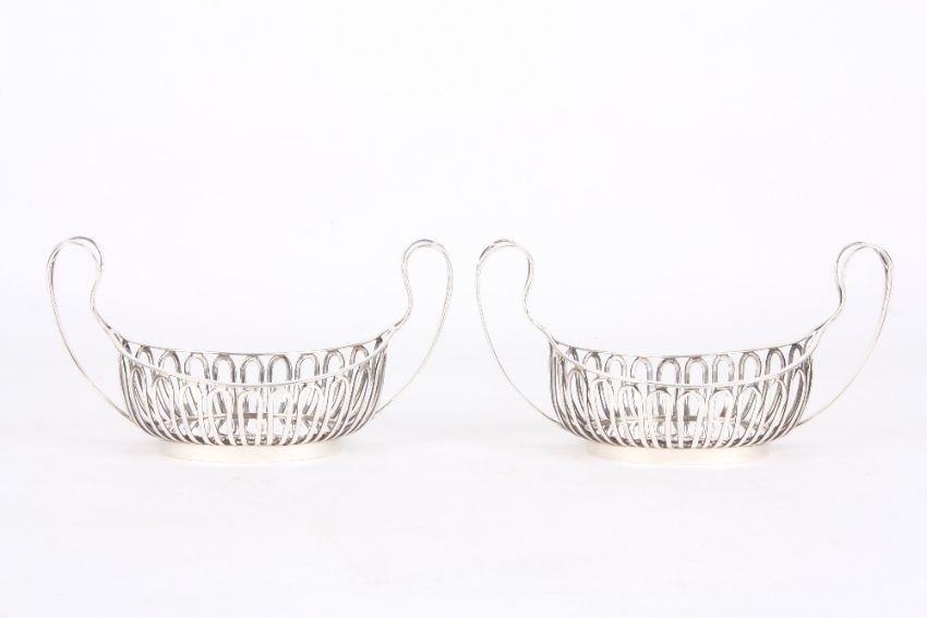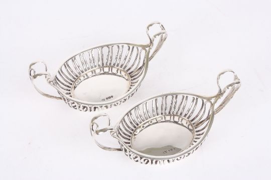 A pair of silver Mappin and Webb bon-bon dishes, hallmarked Sheffield, 1910, of open basket form, 10.8 ozt, length 17cm . In good overall condition, missing liners