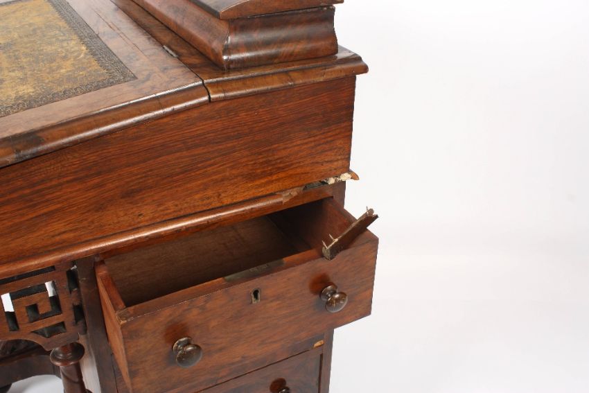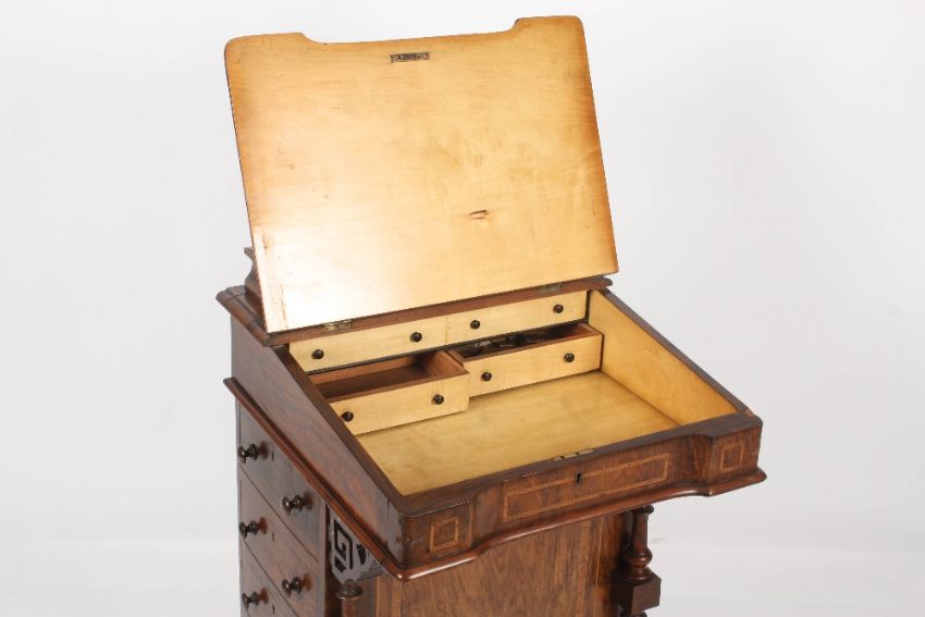 A Victorian walnut veneered davenport, of typical form, with satinwood crossbanding, the lift up top opening to reveal a fitted interior, with tooled leather topped front opening to reveal drawers, four real and four faux drawers to the sides, carved scroll decoration to the front, raised on castors, height 83cm, width 53.5cm . With some wear to overall wood. Some damage to the craved scrolls. Leather top worn but original. Would require some restoration.