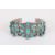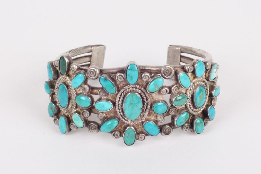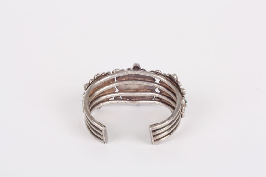A North American Indian turquoise and white metal stiff bangle, the open bangle decorated with turquoise in a flower pattern . One of the turquoise small stones with crack, one of the larger stones with a crack. One turquoise replaced. Would benefit from a clean. Overall in fair condition.