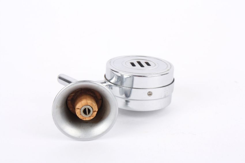 An unusual novelty 1950s chrome plated musical bottle pourer, with bell shaped neck and narrow stem, the shaft with attached wind-up Swiss musical movement which plays when tipped up, unmarked. 13cm wide . Good condition with no damage.